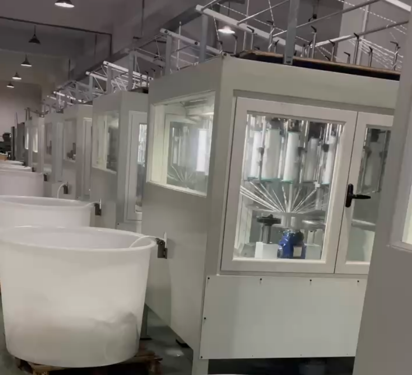 | Ceramic fiber yarn machines produce the twisted ceramic fiber yarns from the cadding strips, can add stainless steel wire, inconel wire, etc., to give extra tensile strength and abrasion resistance. The most popular sizes are 525tex x 2ply, 525tex x 3ply, 630tex x 2ply, 630tex x 3ply, 780tex x 2ply, 780tex x 3ply, 1000tex x 2ply, 1000tex x 3ply, each roll weight can be 1.25kg, 2kg, 2.5kg, pack in bags or boxes with 30kgs per package. Bio soluble fiber yarns are available to produce on the same machines which is marked with light green color for specific outstanding. We have 12 sets ceramic fiber yarn machines to produce 1,500 tons ceramic fiber yarns yearly. |